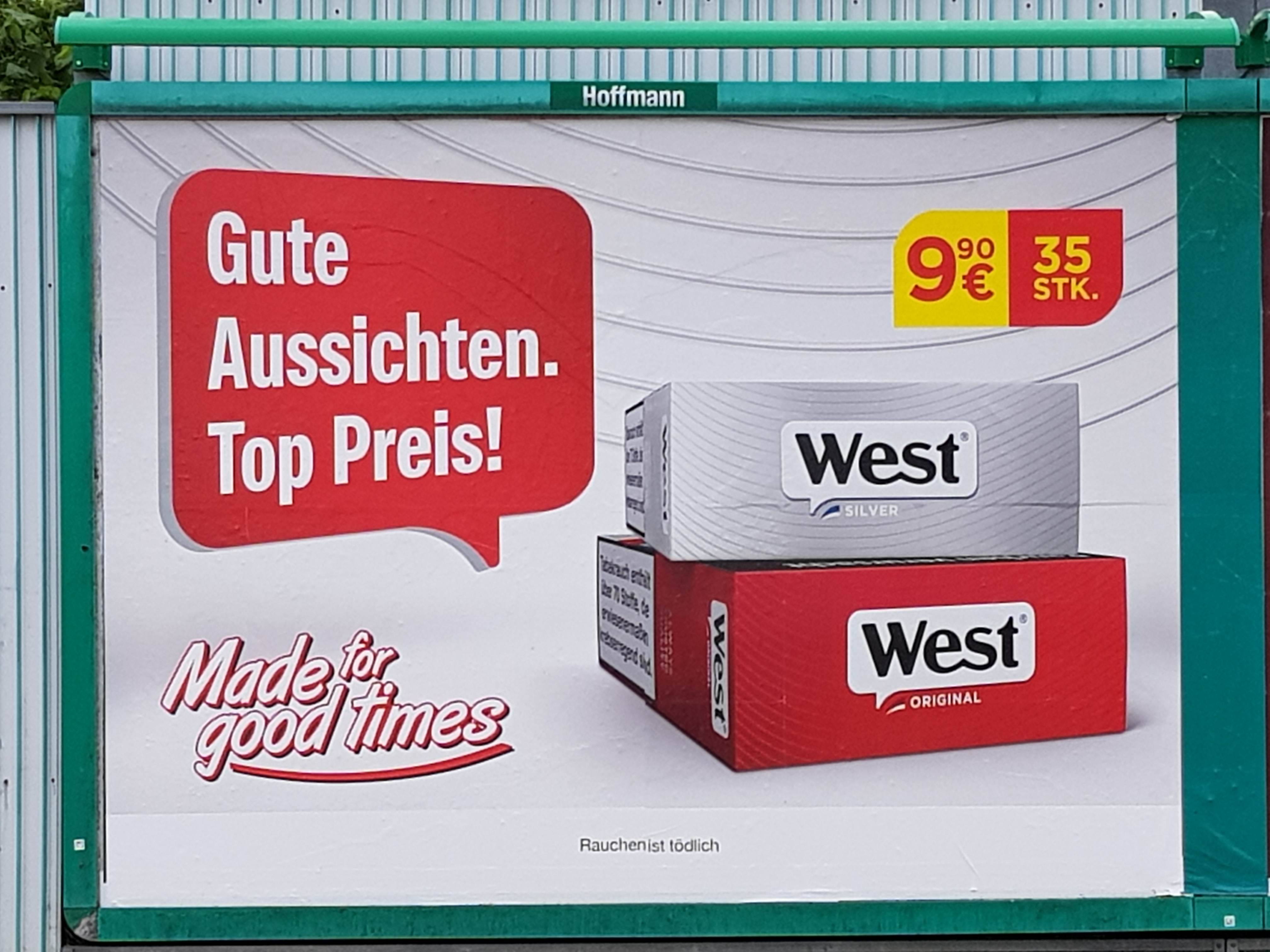 That is genius in comparison to West’s latest advertising. In-your-face West (right). Pretty meaningless. “Gute Aussichten- Top Preis” Good view/outlook? This is all about price, though. 35 fags for 9 Euros. Red or silver. Made for good times, apparently.