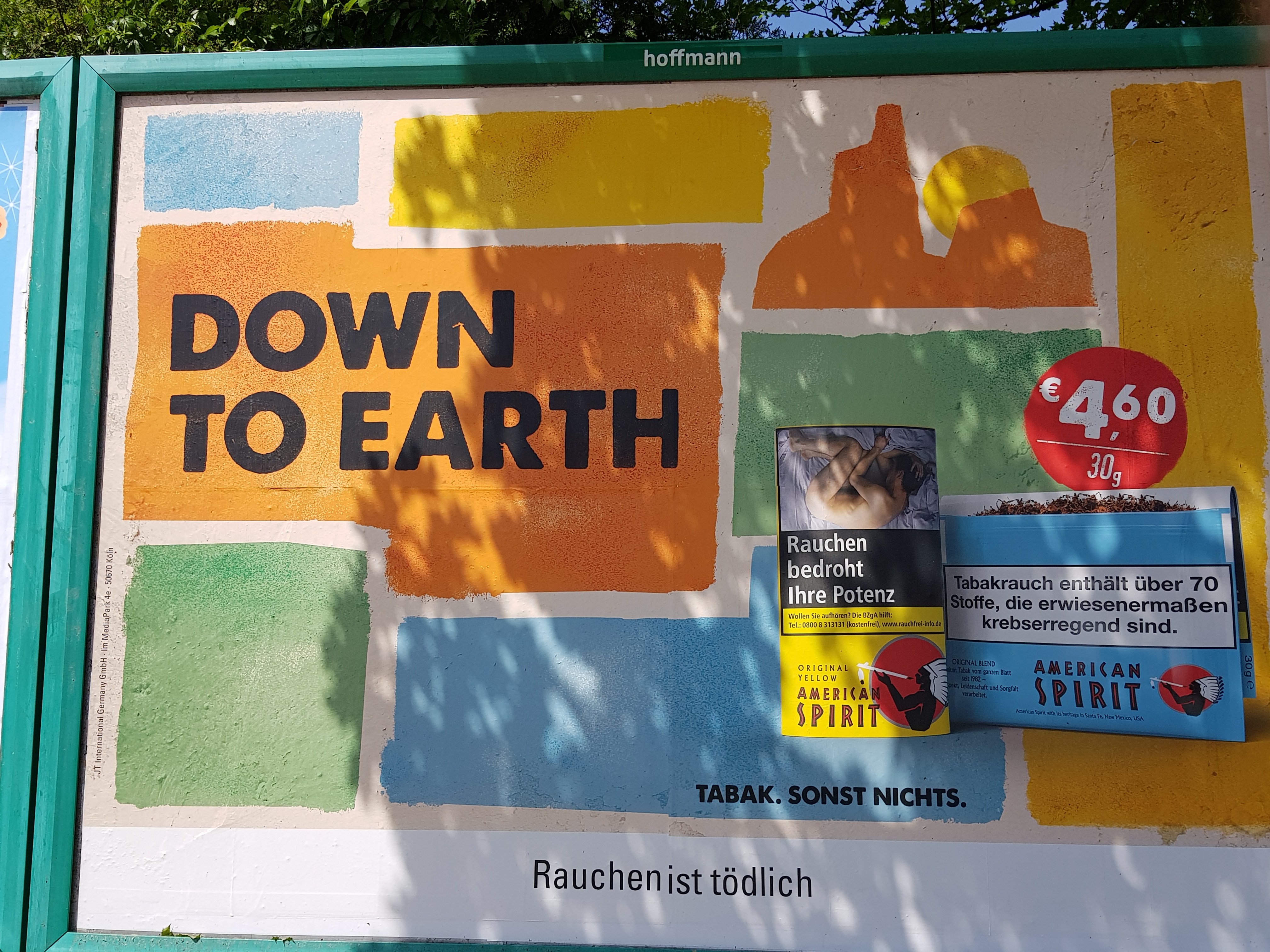 And then there is…Down to Earth rolling tobacco. New up on billboards – though this one of an evening is obscured by a blue van. The campaign approach is not to disguise the harmful effects of tabacco; indeed, quite the opposite. They seem to be proud of their product’s contraceptive properties. Or even its carcinogenic qualities.