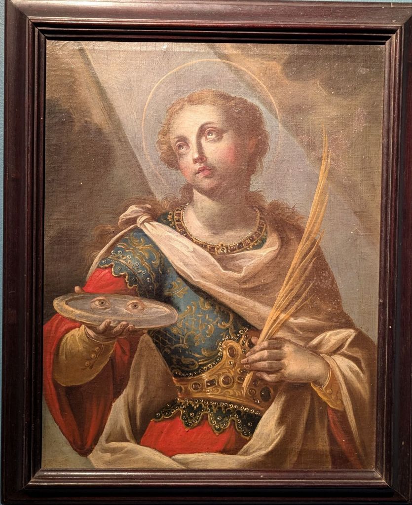 The top floor of the museum is an art gallery with time-limited exhibitions. At the time of our visit (29 November 2024) was a celebration of the work of a Canarian artist, Juan de Miranda. There is, as one might expect for a painter of his era, a lot of religion and aristocracy. But also some quirks. For example, I was intrigued by the portrait of St Lucia dated from around 1785. St Lucia is often depicted with eyes on plate. The meaning is not entirely clear but it is thought to reflect her lack of desire to marry. To be blind and eyeless – or to have one’s eyes literally disembodied – may well help her to avoid what she did not want!