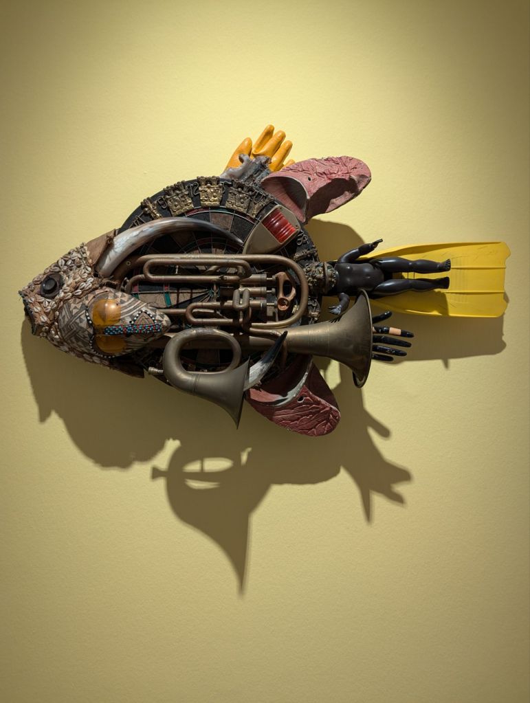 Ové is also a big user of re-used materials. One gallery demonstrates the fun and creativity associated with his approach. For example, for Fish (2009) he used brass instruments, rubber gloves and dolls. There is a series of masks made from old leather jackets dating form a 2024 collection.